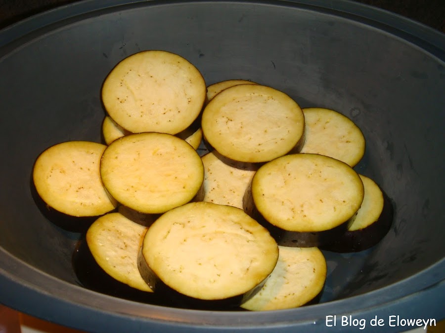 Lavar las berenjenas para quitarles el exceso de sal, ponerlas en el recipiente varoma y salarlas un poco por encima.