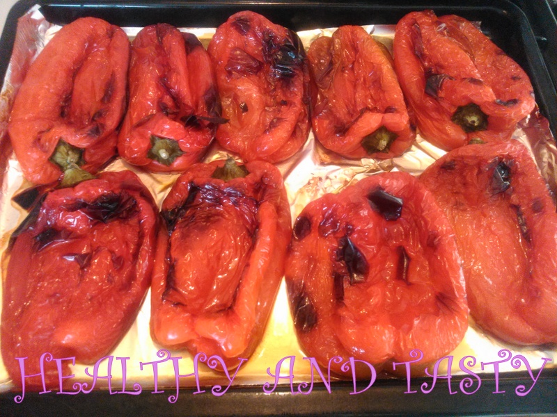 Para asar los pimientos, precalentamos el horno a 180º con calor arriba y abajo. Lavamos los pimientos y los colocamos sobre la bandeja de horno con papel de alumnio. Agregamos un chorrito de aceite de oliva por encima y metemos al horno. Cuando veamos que están dorados pro arriba, les vamos dando la vuelta para que se asen por todos lados. Una vez asados, los sacamos del horno y dejamos templar un poco. A continuación, cuando aún estén templados, les quitamos la piel. Este paso debe darse con los pimientos aún calientes o templados, porque si se enfrían demasiado, será más dificil retirar la piel. Una vez sin piel, los cortamos en tiras y reservamos.