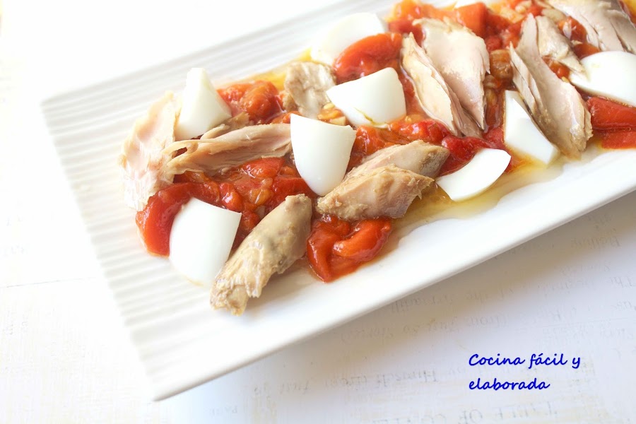 Pelamos los pimientos, los cortamos en tiras pequeñas, añadimos 80 ml. de aceite de oliva, los huevos pelados y troceados, melva, vinagre y sal al gusto.