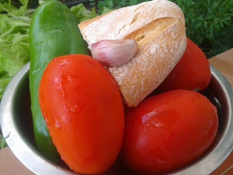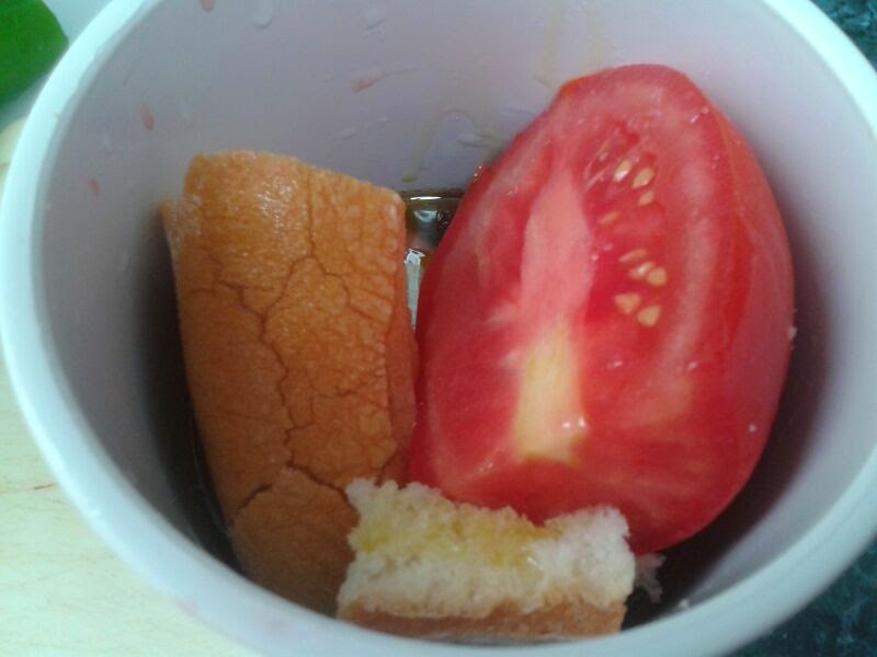 Ponemos en el vaso de la batidora los tomates, el diente de ajo, el pimiento y el pan. Le añadimos un pellizco de sal, aceite de oliva, vinagre de vino y un poco de agua (sin excedernos en el agua ya que después añadiremos hielo para que se ponga bien fresquito).