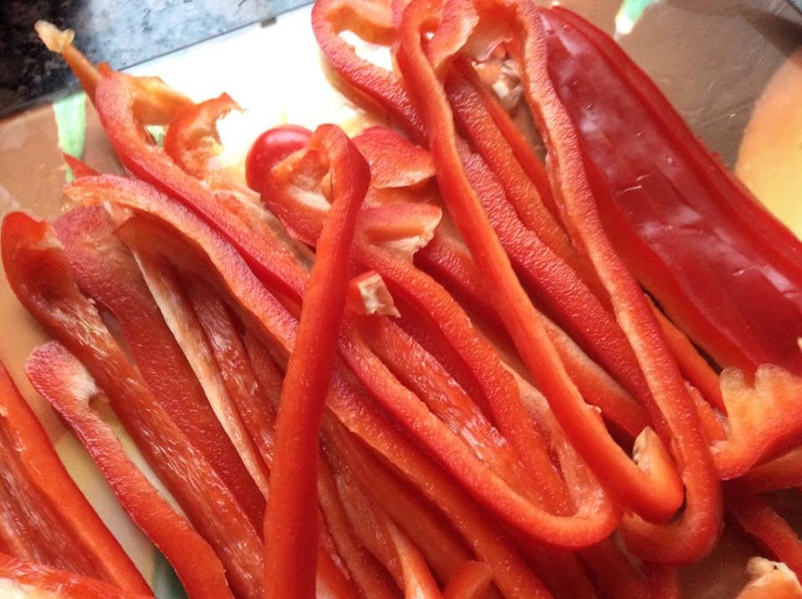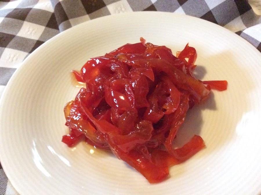 Poner el agua y el azúcar a fuego fuerte, y revolver un poco, cuando el azúcar se haya disuelto, añadir el vinagre y los pimientos.