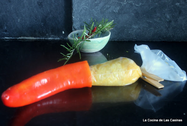 Puedes rellenar el pimiento de dos maneras, yo he utilizado una bolsita de manga pastelera, puedes hacerlo con una cuchara, el primer plan es más cómodo.