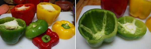 Por otro lado lavamos los pimientos y secamos, cortamos la base que será la tapa del pimiento. Con ayuda de un cuchillo con puntilla , retiramos todas las pepitas y las partes blancas con cuidado de no romper el pimiento. Los ponemos en una fuente para horno y reservamos.