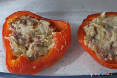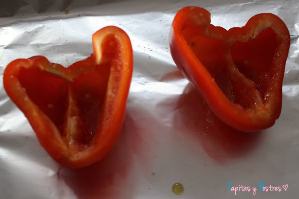 Comenzamos asando el pimiento. Lo lavamos y cortamos por la mitad, pintamos con aceite y horneamos a 180º unos 20 minutos. Tiene que quedar tierno pero firme.