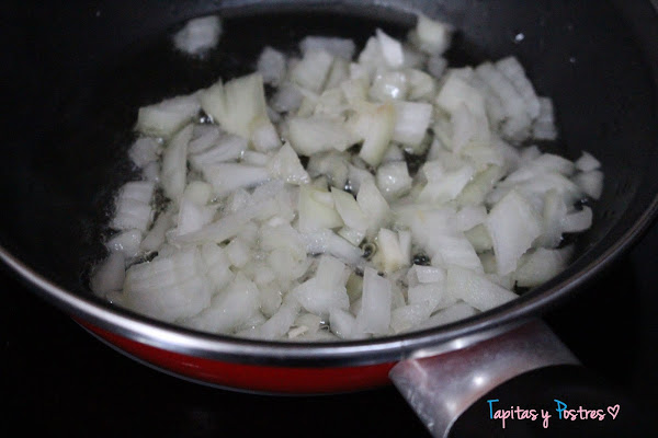 Nos ponemos con el relleno, troceamos la cebolla y la sofreimos en una sartén hasta que esté transparente.