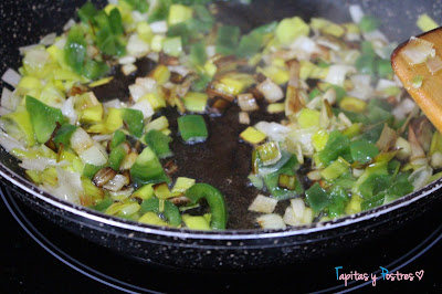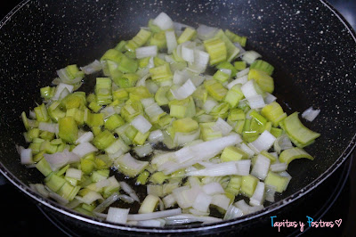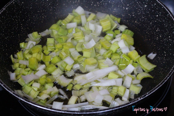 Vamos con la salsa, en una sartén con un fondo de aceite pochamos el puerro troceado.
