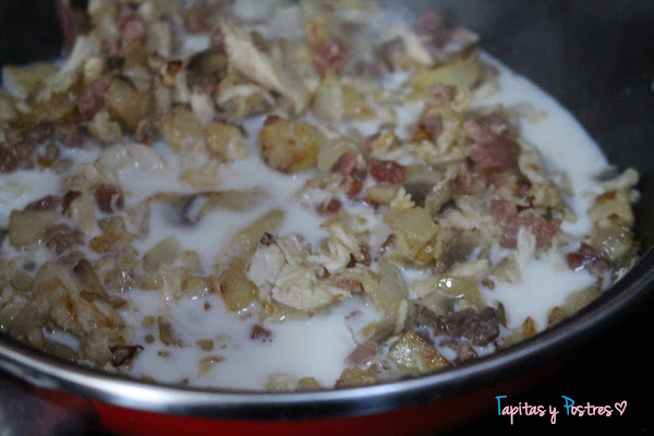 Añadimos la leche, un pellizco de sal, pimienta y nuez moscada. Removemos durante unos minutos hasta que nos quede una masa espesa similar a la de las croquetas.