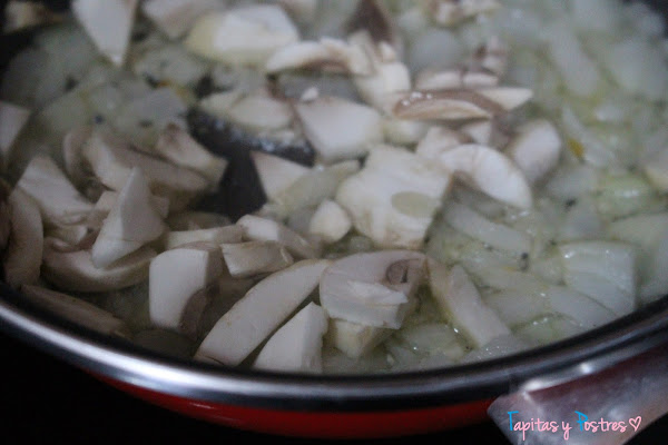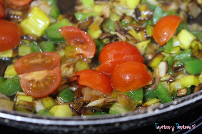 Y el tomate troceado o en mi caso los cherrys. Dejamos que se poche todo hasta que estén hechos.