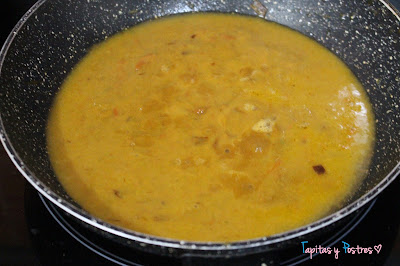 Trituramos el sofrito, agregamos el vino, la pastilla de caldo y cocinar un poco para evaporar el alcohol. Reservamos la salsa.