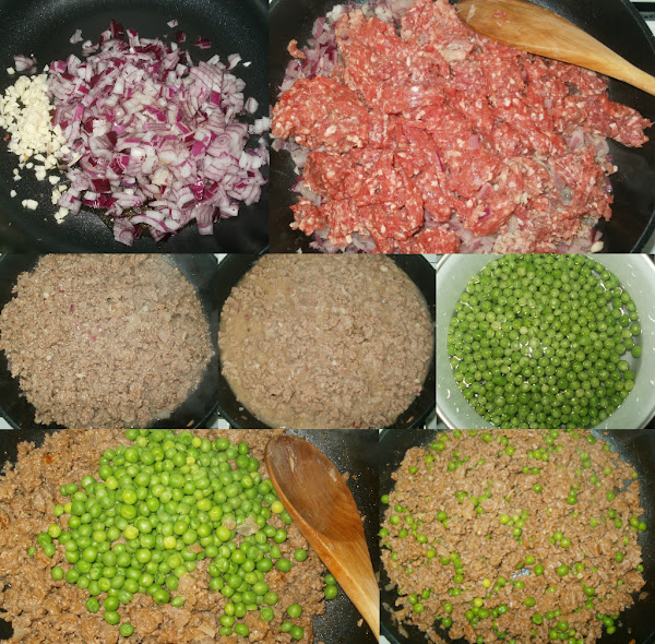 En una sartén calentamos las 3 cucharadas de aceite y sofreímos la cebolla junto con el ajo a fuego medio. Cuando la cebolla esté transparente añadimos la carne picada y subimos el fuego, mezclamos muy bien y cocinamos por 5 minutos o hasta que la carne esté casi hecha. En este punto, salpimentamos la carne, le adicionamos el vino blanco y la cocinamos hasta que el vino se reduzca. Entretanto, ponemos a calentar una taza de agua en un cazo, cuando esta comience a hervir, echamos los guisantes y los cocemos por 6 minutos.