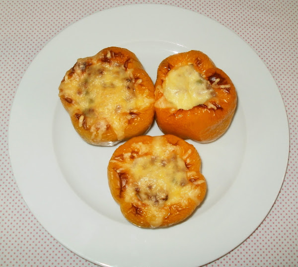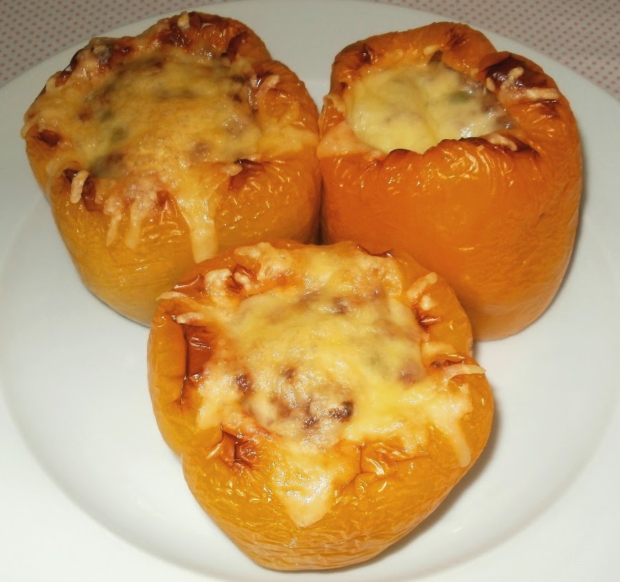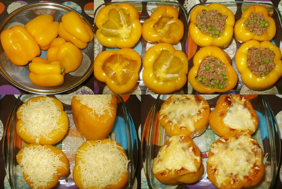 Ahora preparamos los pimientos: primero los lavamos muy bien y les retiramos con cuidado las tapas y los pedúnculos, los limpiamos por dentro y les quitamos todas las semillas. Precalentamos el horno a 180 ºC. Rellenamos los pimientos con la carne picada, rociamos el fondo de una fuente de horno con un poco de aceite de oliva y colocamos en ella los pimientos rellenos. Horneamos por 25 minutos. Pasado ese tiempo sacamos los pimientos del horno, los cubrimos con queso emmental y los seguimos horneando durante 20 minutos más.