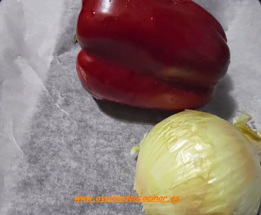 Colocarlos en una bandeja con papel de horno. (En esta ocasión añado cebolla, por que la necesitaré para realizar mi Coulis)