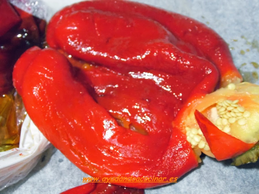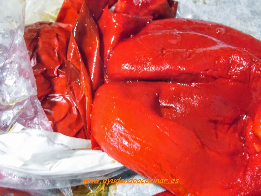Una vez ha transcurrido el tiempo necesario, retirar del horno y dejaremos que los pimientos "suden". Para ello podemos introducirlos en una bolsa de plástico y cerrarla con un nudo.