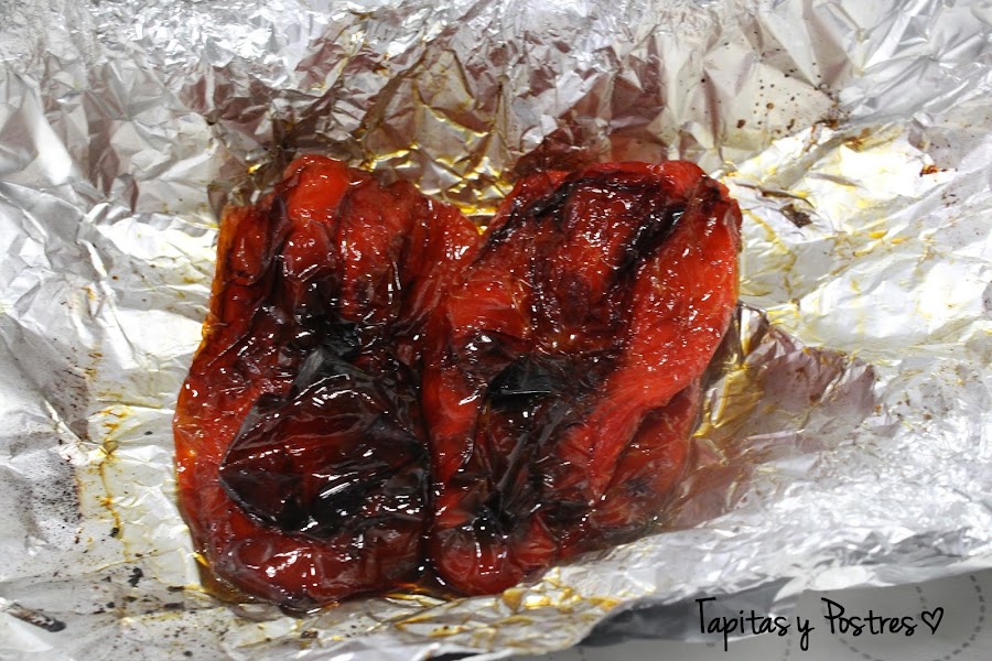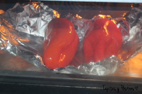 Precalentamos el horno, calor arriba y abajo a 200º. Ponemos los pimientos sobre un trozo grande de papel de aluminio y horneamos unos 45 minutos, dando una vuelta a los pimientos cuando los veamos tostados por una cara.
