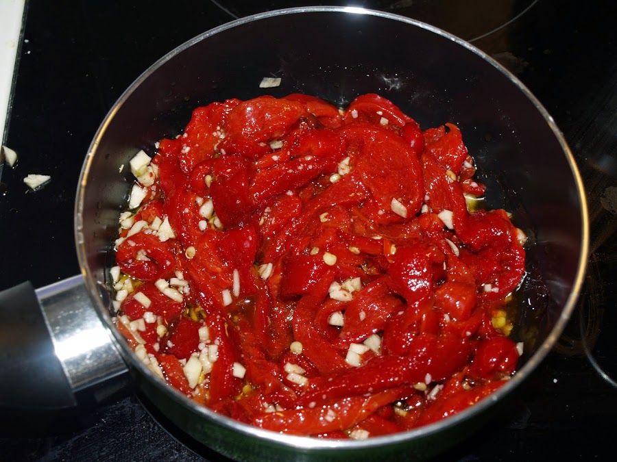 - Picamos ajo muy finito, en lonchas o cubitos, y lo ponemos junto con los pimientos, sal al gusto y un buen chorro de aceite en un cazo.