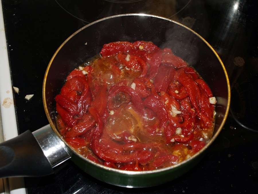- A continuación cortamos los pimientos en tiras y reservamos.