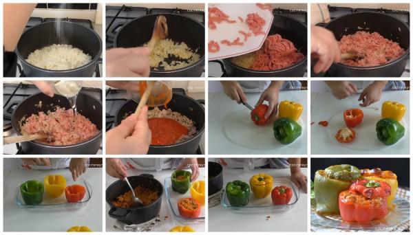 Una vez que tenemos la carne en su punto rellenamos con ella los pimientos justo hasta arriba y cerramos con la parte de arriba del pimiento como si fuera la tapadera de una cazuela.