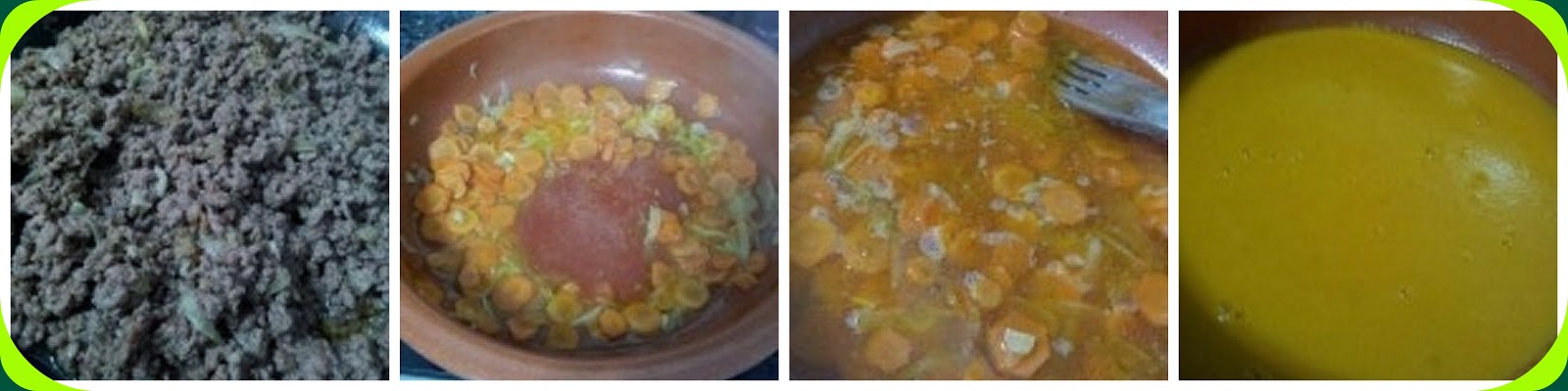 Hacer un sofrito con el ajo y la cebolla, cuando dore añadir la carne picada y rociar con un poco de perejil y sal. Reservar.