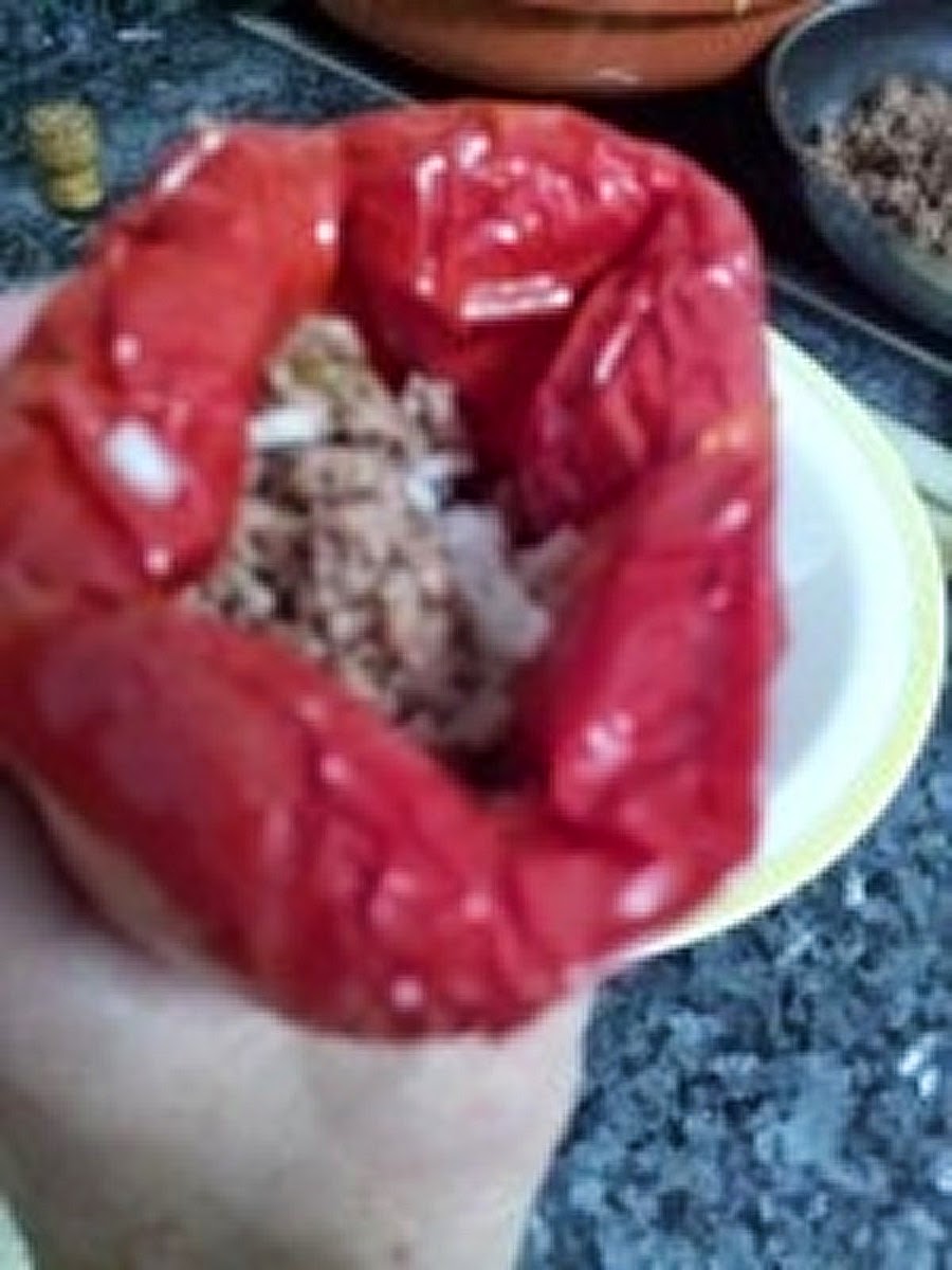 Ya tenemos todos los ingredientes preparados, ahora iremos rellenando los pimientos con la carne picada y el arroz y los iremos dejando en la cazuela de barro, dejaremos cocer la salsa junto con los pimientos para que se mezclen todo y listo para servir, como ya comente antes, es un plato muy completo que podemos acompañar de unas patatas fritas o una buena ensalada.