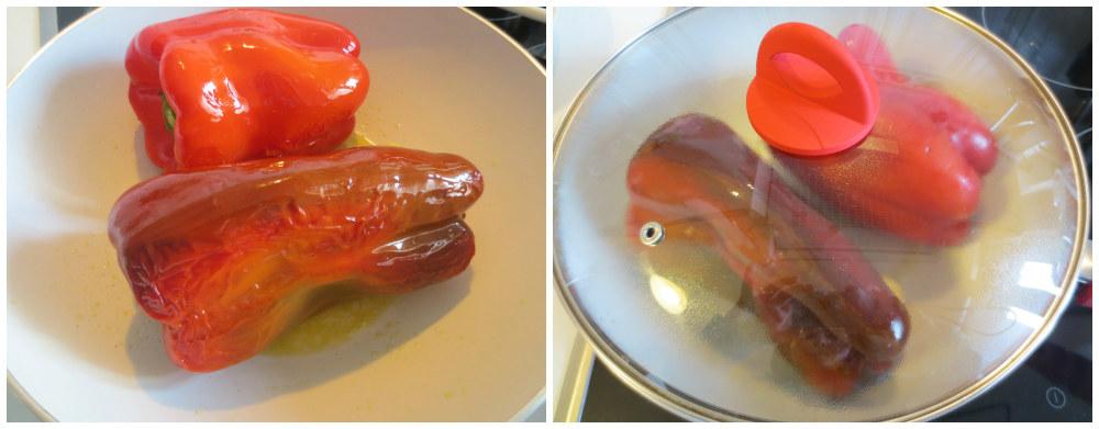 4. Hemos empezado con un fuego medio-alto. Hay que controlar que la piel no se queme mucho (sobretodo al principio). Cuando empiece a chisporrotear y coger calor la sartén, se les da la vuelta a los pimientos, se baja el fuego y se tapa la sartén para que guarde el calor y que evite que se evapore la humedad que van a soltar los pimientos, así tendremos una salsita estupenda.