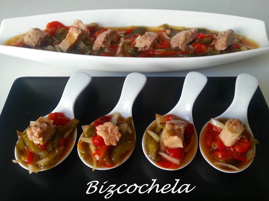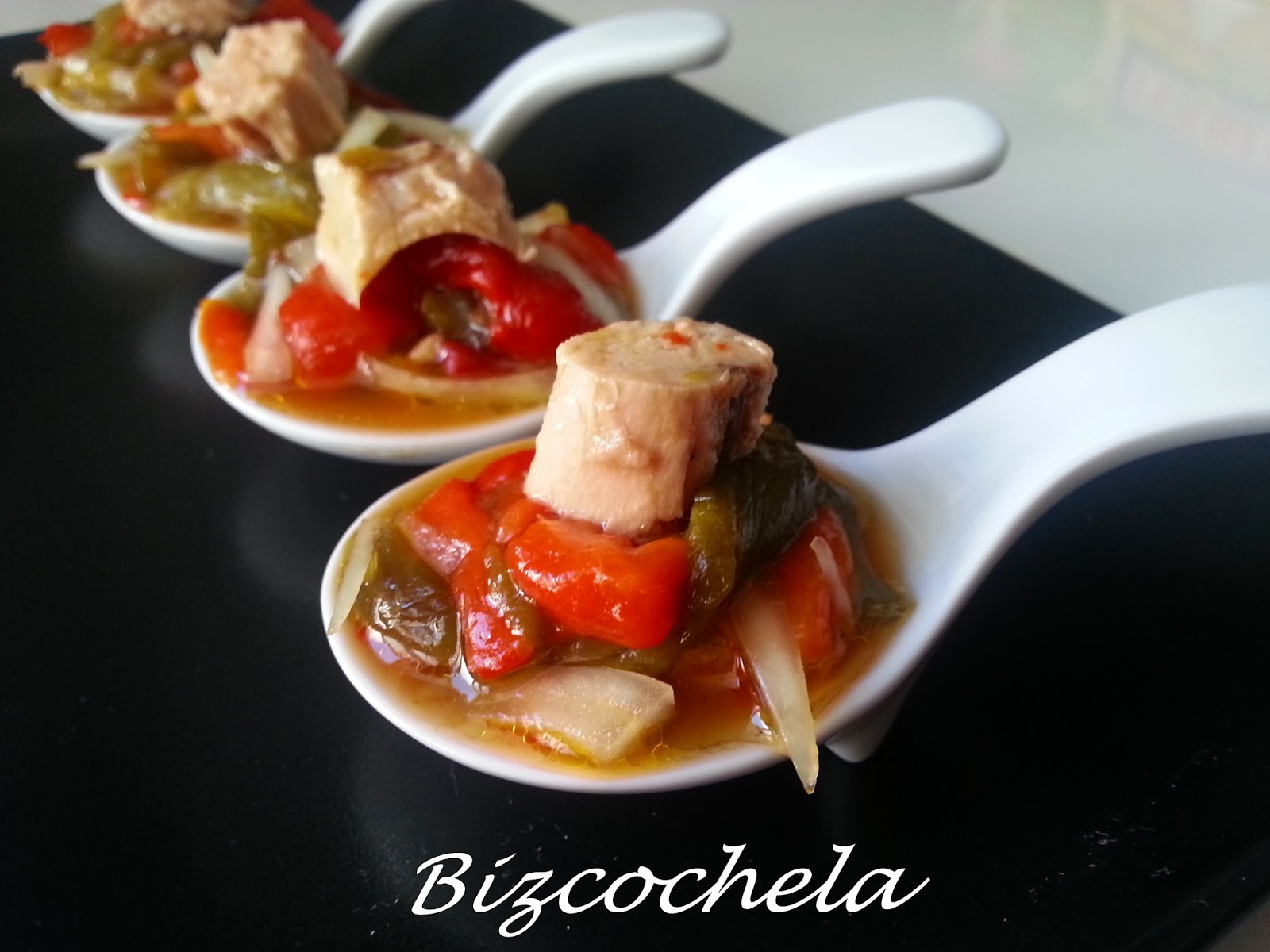 Aquí os propongo en versión cucharitas chic o como ración, y también os pongo con y sin atún.Lo más entretenido es asarlos, que la hora no la quita nadie, pero luego es muy rapidito.