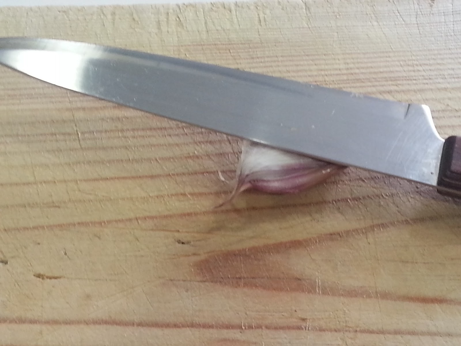 1. - Encendemos el horno a 180º y vamos aplastando los dientes de ajo con piel con un cuchillo.