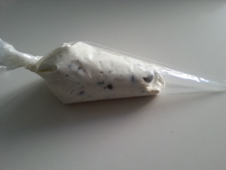 4. - En un cuenco, mezclamos el queso con las alcaparras y lo metemos en una manga pastelera, o, si no tenéis, en una bolsa de conserva y le cortáis una de las esquinas, a modo de boquilla.