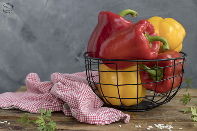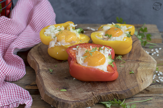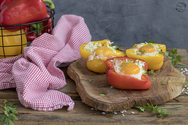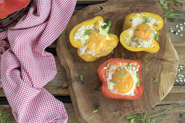 Mi amiga Ana siempre que queda con nosotros viene con el maletero del coche cargado de pimientos. Son los mejores pimientos que he probado, además pasan horas desde que los coge hasta que nos los trae, por lo que están con ese brillo especial que sólo puede tener un producto fresco. En esta ocasión los he rellenado de arroz, que va aderezado con un poco de AOVE, con queso mozzarella y fiambre de pechuga de pavo, y para terminar lo he coronado con una yema de huevo. Y así aprovechaba las claras para otra preparación que tenía pendiente.
