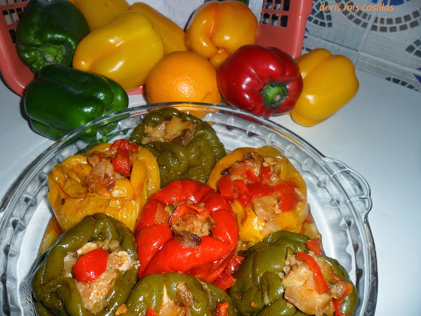 Limpiamos los pimientos con agua, retiramos las semillas y quitamos el sombrerito para poder rellenarlos, los ponemos boca abajo para que eliminen el líquido.
