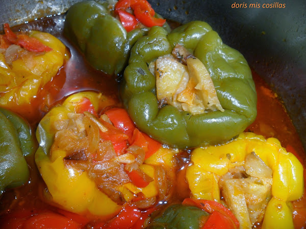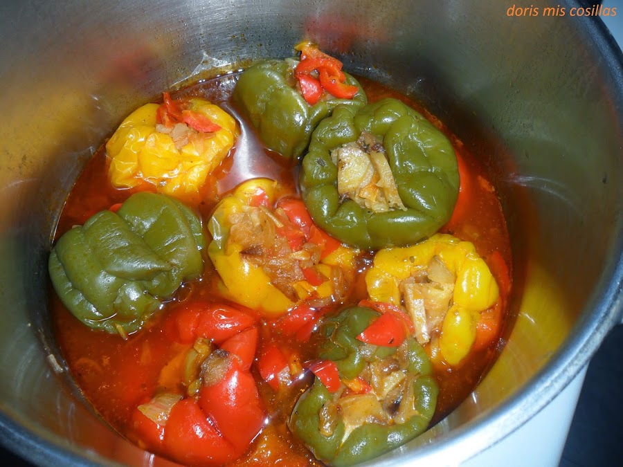 Rellenamos los pimientos reservados con esta mezcla y los ponemos bien apretados en la olla rápida mientras preparamos la salsa...