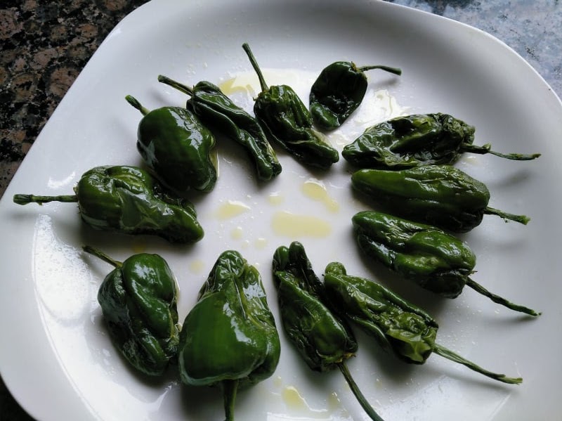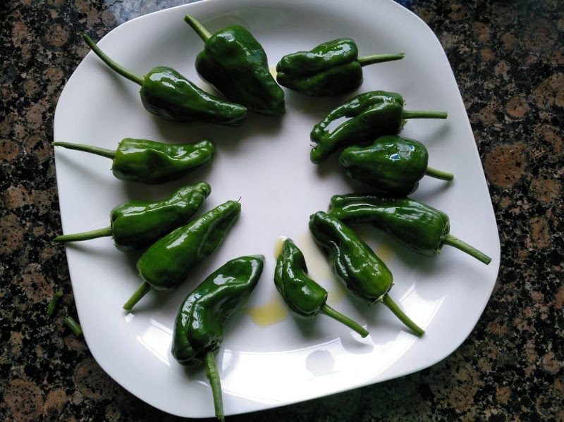 Echamos el aceite y revolvemos para que queden embadurnados. Si vamos a hacer más cantidad de pimientos, no es necesario que aumentemos el aceite en proporción, podemos, añadiremos un poco más si vemos que no quedan embadurnados.