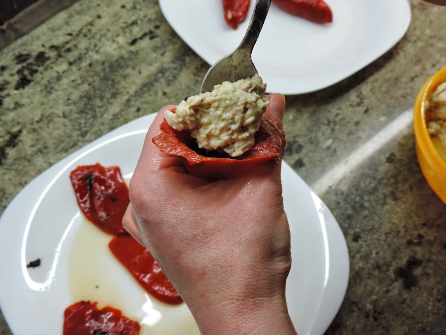Con la ayuda de una cuchara vamos rellenandolos de ensaladilla.