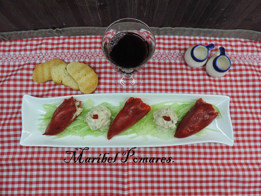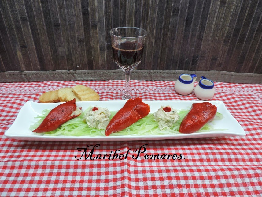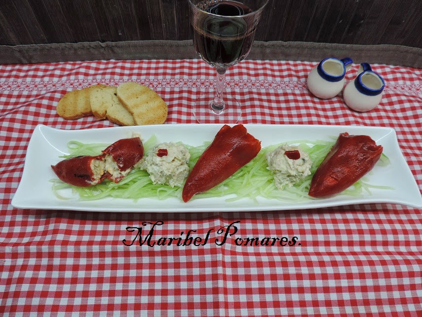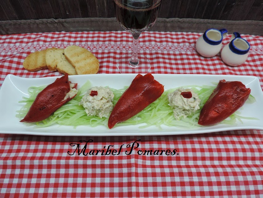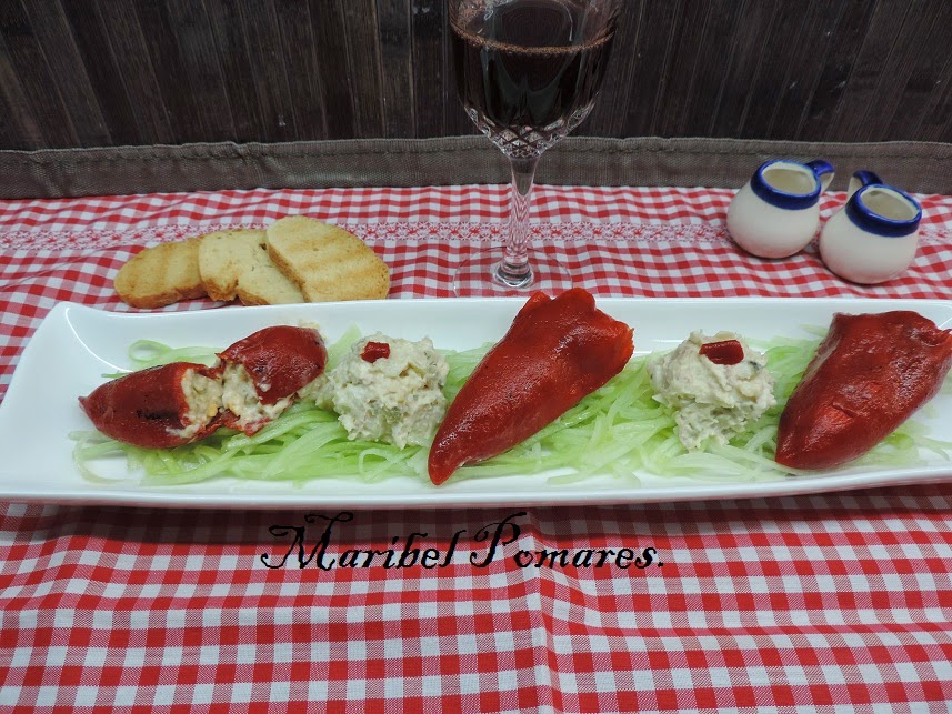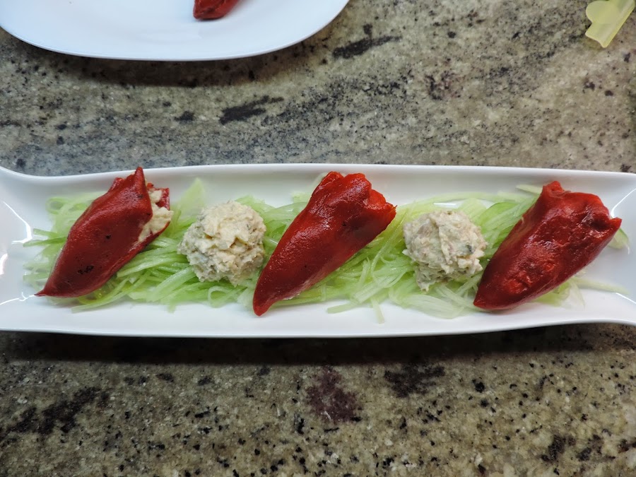 Encima del pepino ponemos los pimientos rellenos y como me ha sobrado una bolita de ensaladilla en medio.