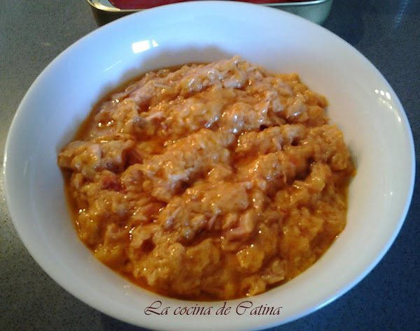 En un cuenco aparte reservamos un poco de bechamel para preparar la salsa de pimiento. Incorporamos el atún desmenuzado y las anchoas cortadas en trocitos a la sartén donde tenemos el resto de la bechamel.