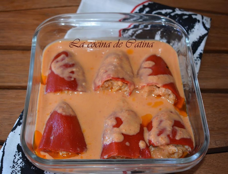 Ponemos casi toda la salsa en el fondo de una fuente apta para horno, colocamos sobre ella los pimientos rellenos y se riegan por encima con la salsa restante.