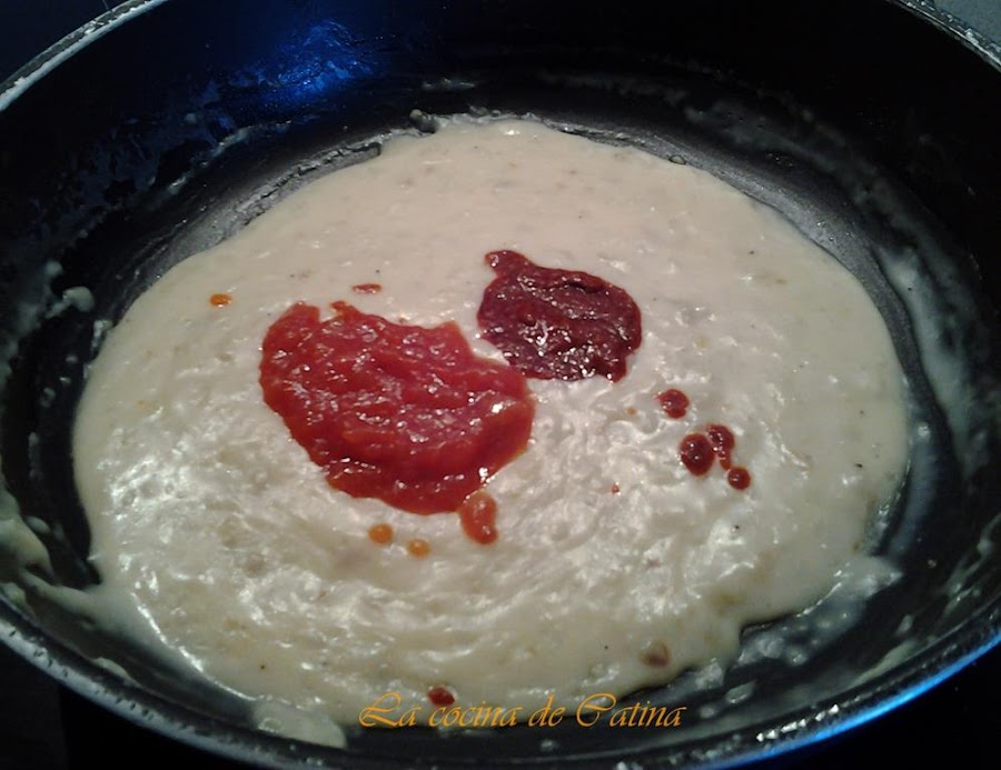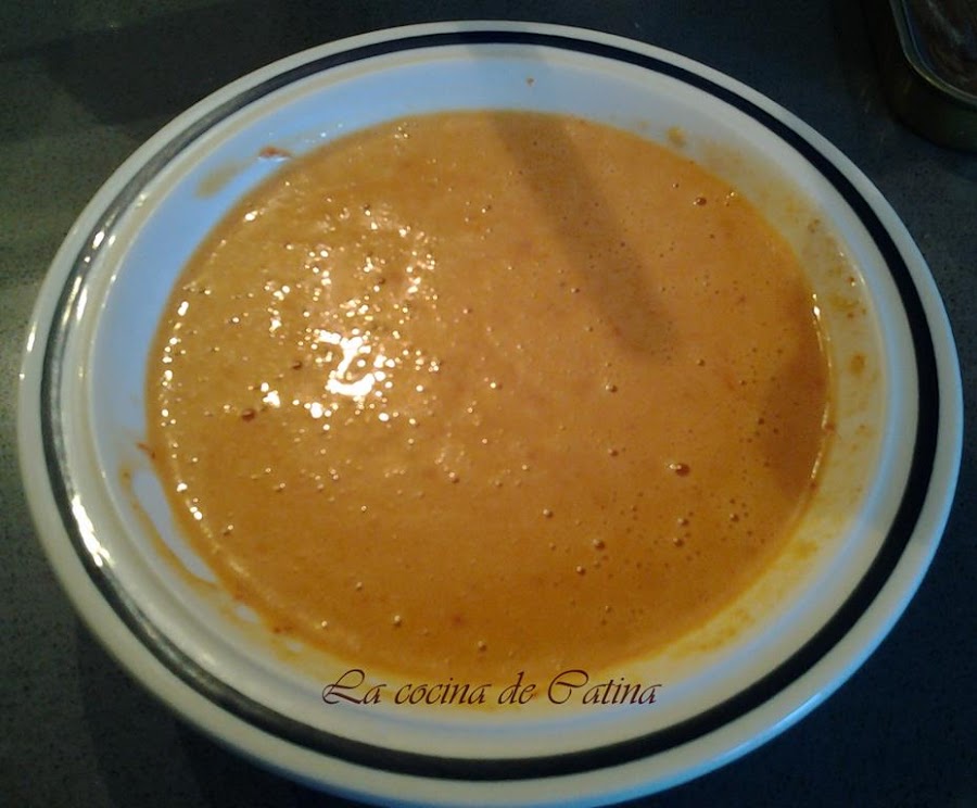 A la bechamel reservada le añadimos unas cucharadas de caldo de pescado y un pimiento de piquillo. Lo pasamos por la batidora hasta conseguir una salsa que no sea muy espesa.