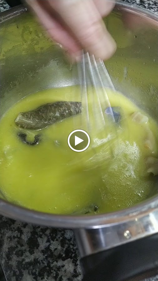 El aove con las pieles de bacalao que nos a sobrado, con una barillas montaremos el pil pil.