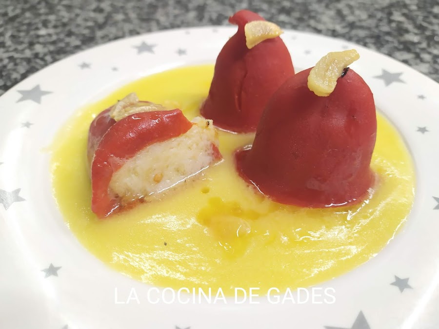 Para emplatar en la base del plato pondremos el pil pil y encima los pimientos rellenos.