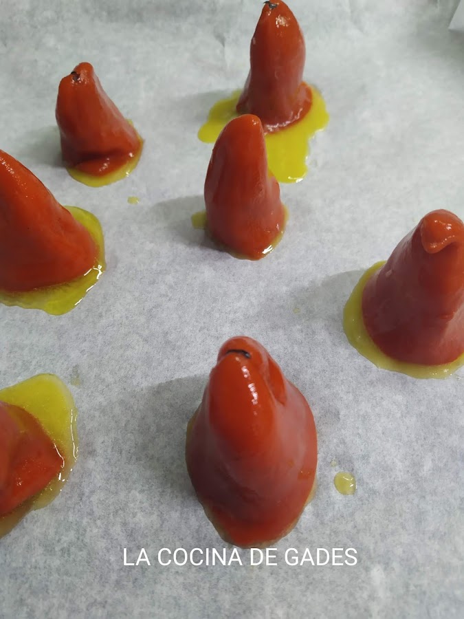 Los pimientos le cortamos los filos y los ponemos derechos y rellenamos, ponemos en la bandeja del horno boca arriba y pintamos con el vinagre con la miel y gratinamos en el horno 200°.
