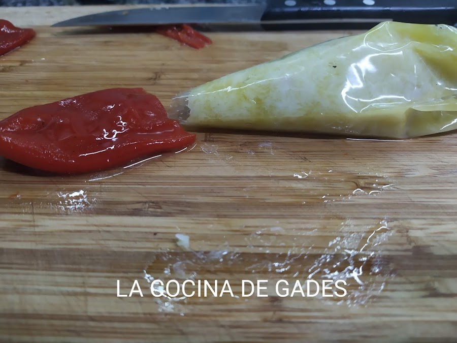 El bacalao lo majamos en el mortero y echamos a poquito el aove, hasta que nos quede muy meloso, llenamos en una manga, si no tienes manga usa una cucharita.