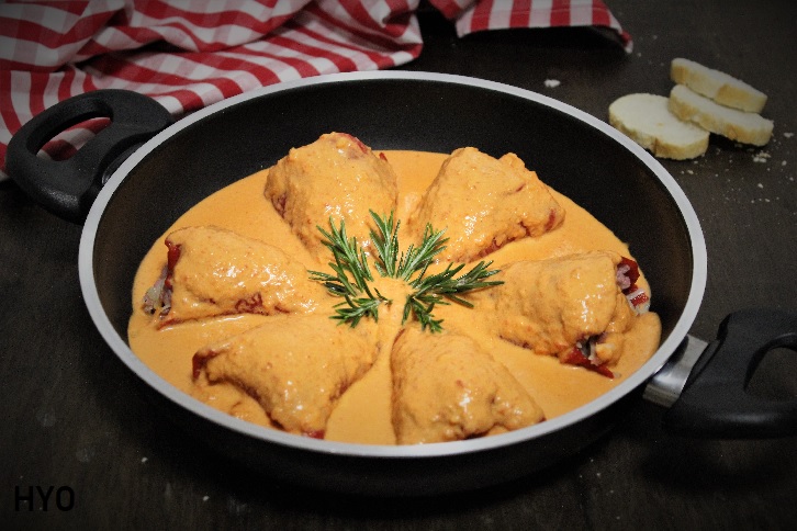 3. Ahora vamos a preparar la salsa. Troceamos groseramente la cebolla y los cuatro pimientos de piquillo. Pochamos bien en una sartén con un poco de aceite e incorporamos el tomate natural triturado. Sofreímos un ratito, echamos el vino y dejamos que el alcohol se evapore. Por último, añadimos la nata (crema de leche) y salpimentamos. Dejamos cocinar unos cuatro o cinco minutos, con cuidado de que nada se pegue y retiramos del fuego.