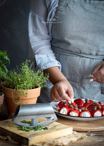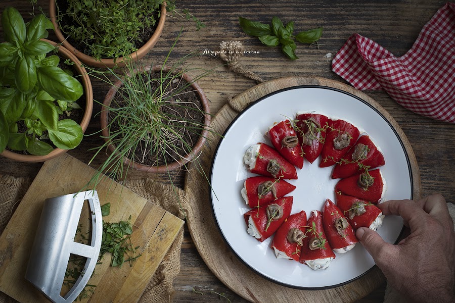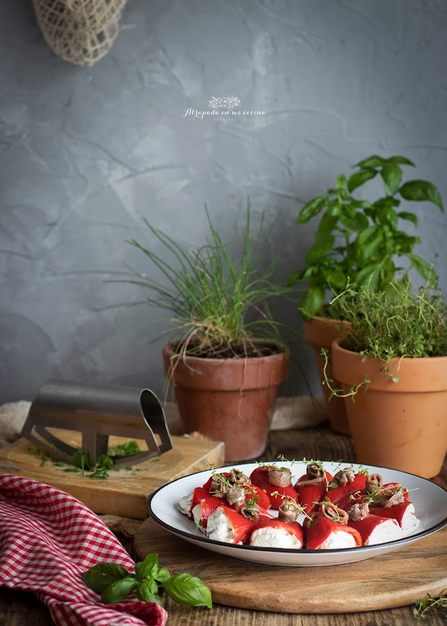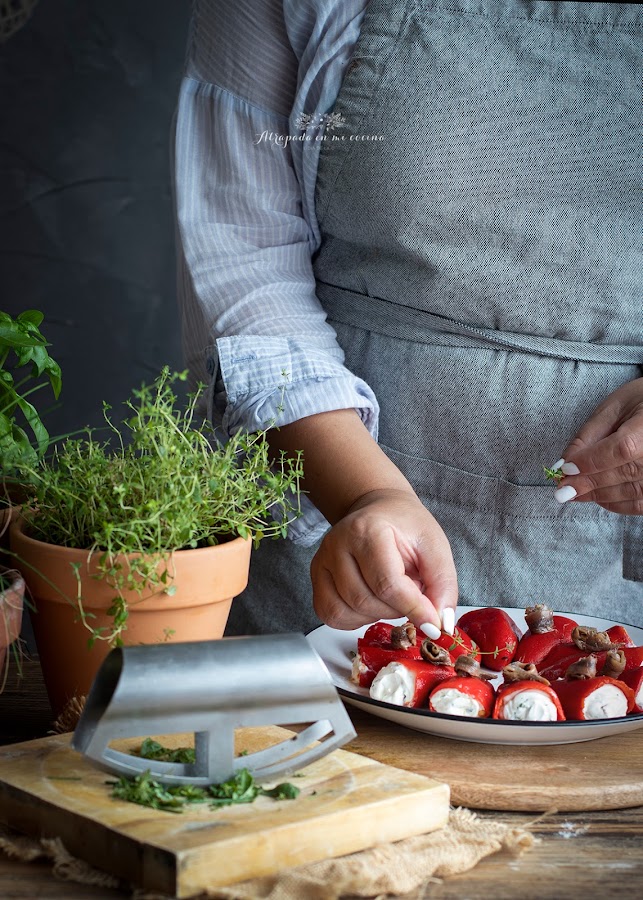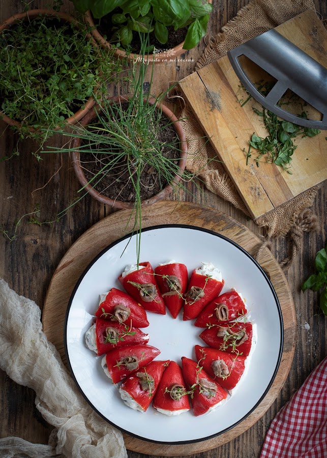 Empezamos la semana con una receta muy veraniega, se trata de pimientos del piquillo rellenos de crema de queso y anchoas. Un aperitivo delicioso para preparar cuando tengamos visita en casa. Importante es que la materia prima sea buena, sobre todo los pimientos del piquillo y las anchoas. Los prepararemos unas horas antes y meteremos en la nevera, y a última hora pondremos la anchoa por encima y la rama de tomillo para decorar.