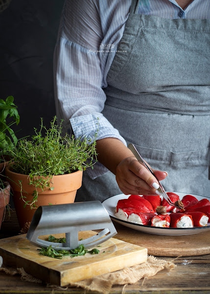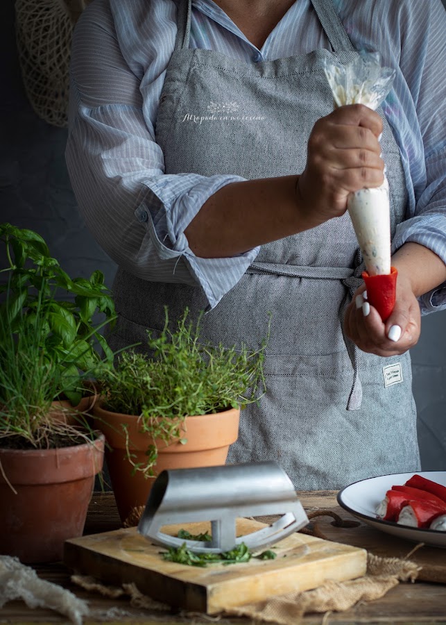 Introducimos la crema en una manga pastelera (yo sin boquilla, luego se corta la punta con unas tijeras). Con la ayuda de la manga vamos rellenando los pimientos y los dejamos sobre el plato de servir. Tapamos con film transparente y llevamos a la nevera durante un par de horas.