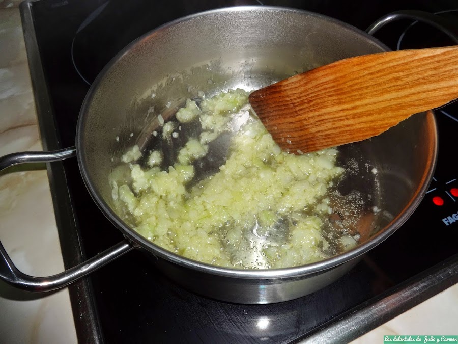 Picamos muy fino la cebolla y el ajo y lo pondremos a pochar en una olla con aceite a fuego bajo. Cuando la cebolla esté dorada, verteremos la harina y la cocinaremos un poco para que se tueste y no deje sabor a crudo, removiendo constantemente.