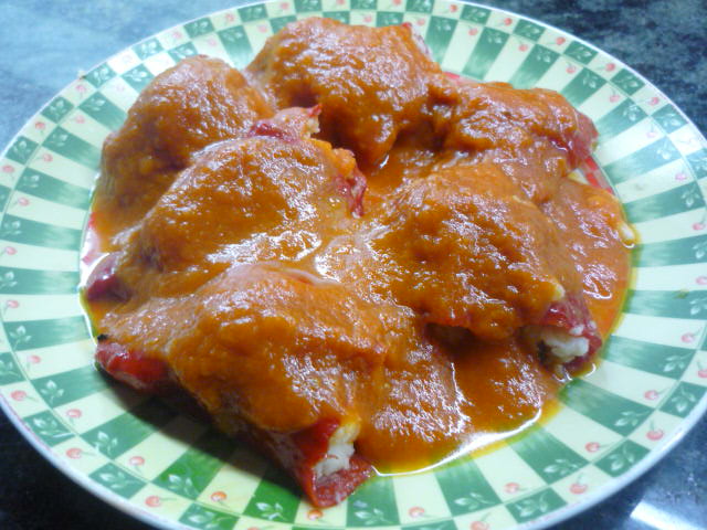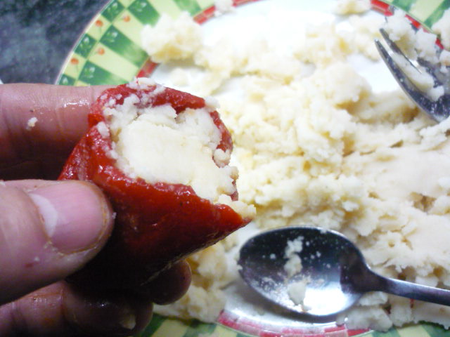 1.- Rellenar los pimientos con el puré frío con ayuda de una cucharilla.