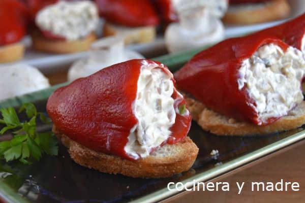 Dificultad: muy fácil Raciones: 8 unidades Tiempo: 10 minutosIngredientes de los pimientos del piquillo rellenos de queso y champiñones: