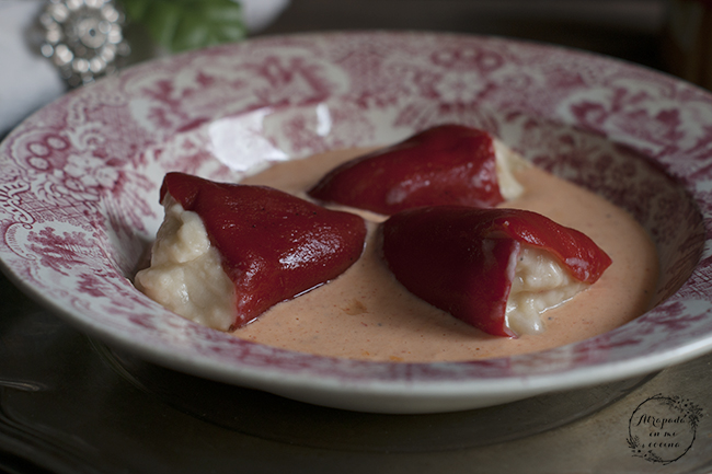 Seguimos con las ideas que pueden formar parte de nuestros menús navideños. En esta ocasión os propongo un entrante delicioso. Unos pimientos del piquillo rellenos de rape y langostinos. El interior no es más que una bechamel donde encontraremos tropezones de rape y de langostinos, y la salsita con la que los hemos acompañado es el mismo relleno aligerado con un poco de nata (crema de leche) y coloreado con un pimiento. El resultado es muy bueno y os lo aconsejo para cualquiera de los días de fiesta que se avecinan.