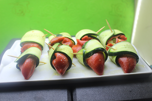 Rodeamos cada pimiento relleno con una loncha de pepino, aguantando esta con la ayuda de un palillo.
