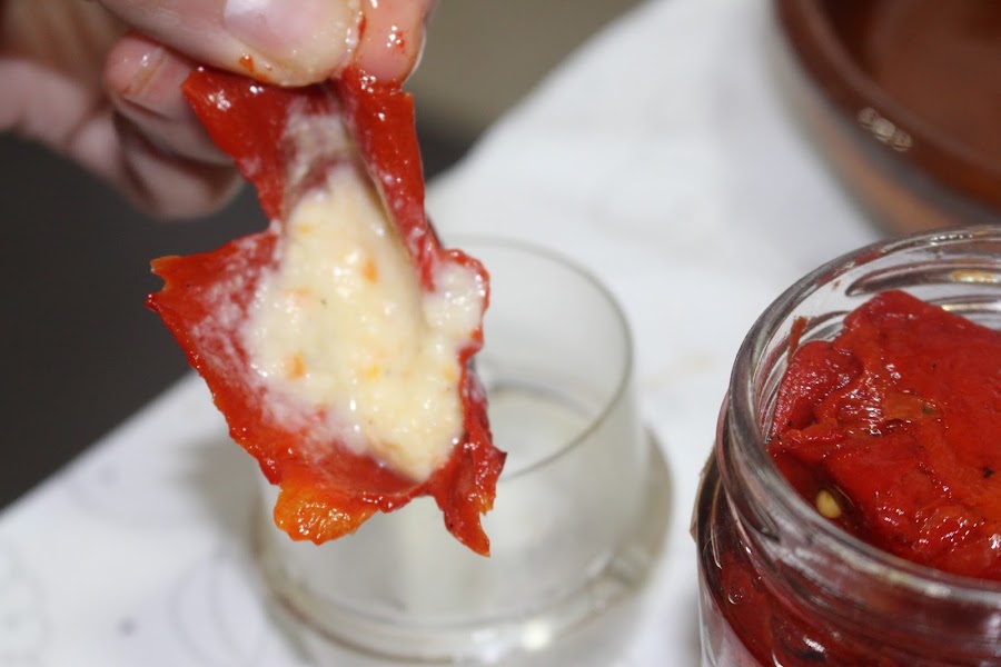 Rellenamos los pimientos con una cucharita y los dejamos en una fuente de horno mientras preparamos la salsa.
