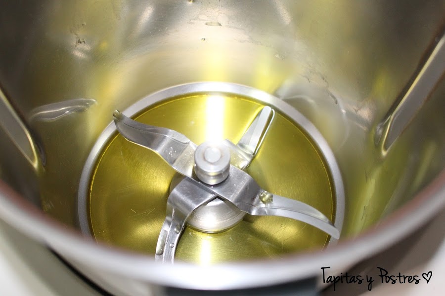 Ponemos el aceite en el vaso de la thermomix y calentamos 3 minutos, varoma, velocidad 1